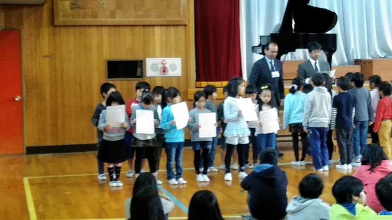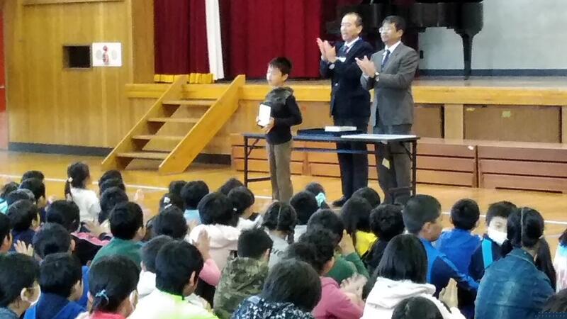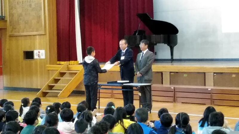 ↑表彰(左から6年飯島さん、4年工藤さん、5年佐藤さん)