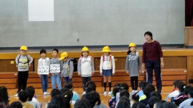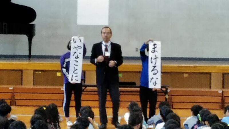 ↑校長から「いやなことにもまけるな」の話 ↑今月の生活目標「言葉づかい」(1年生)