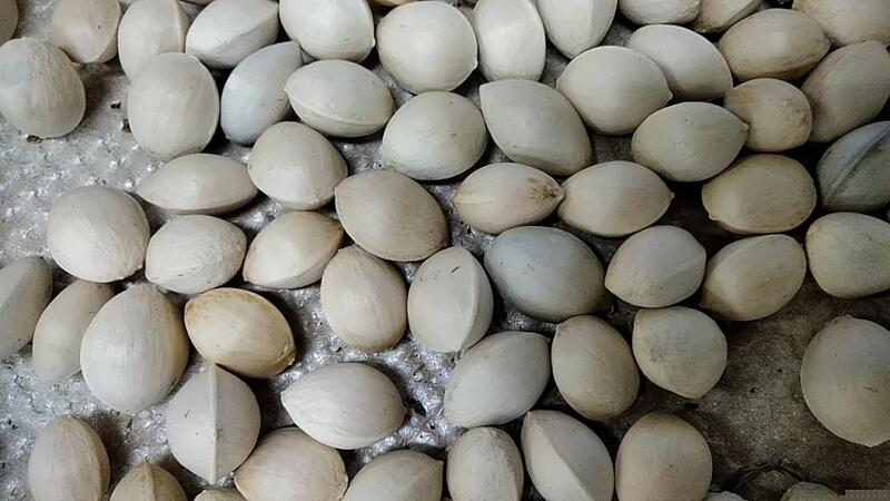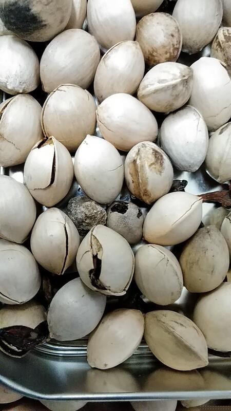 ①拾ったイチョウの実(銀杏)②バケツに入れまわりの皮をむきます③水洗いしてこの通り