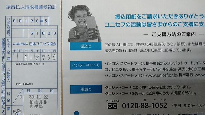今日役員で、郵便局に行き「ユニセフ」に全額募金しましたので報告します。