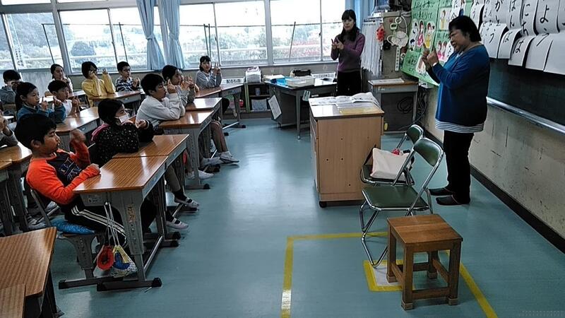 ↑手話「オークの会」の松村さんと松尾さんにあいさつや自分の紹介などを教えてもらいました