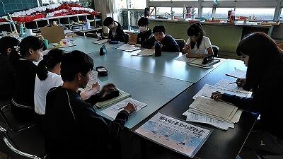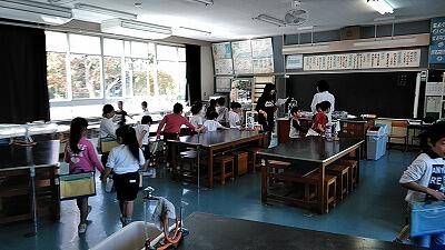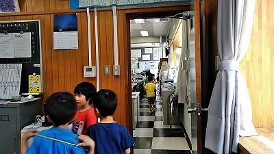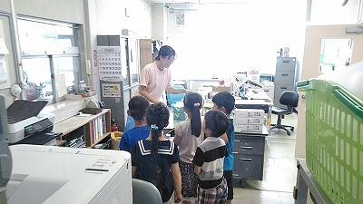 ↑グループごとに校舎内をまわります ↑事務室で清水栄養士さんに聞いているところ