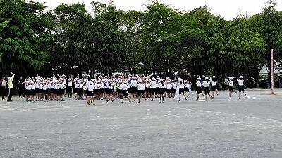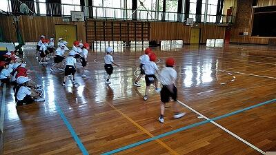 ↑4列に整列し、体操のたいけいになり、準備運動です ↑走ったりスキップしたり…