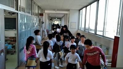 ↑避難開始(一番速かった2階の6年生) ↑校長の話「自分の命は自分で守る」