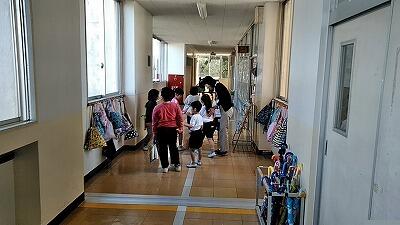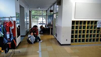 1年生にとっては,初めての「雨登校」でした。ふだんは7:50にならないと昇降口から中に入れないのですが,雨,雪や寒い日などの時は,校舎に入り1階廊下で待つようにしています。