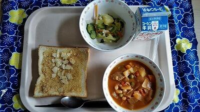 ←今日の給食(アーモンドトースト・パインサラダ・ポークビーンズ)