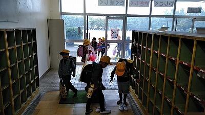 ↑昇降口前 ↑下駄箱 ↑廊下で待っている1年生他