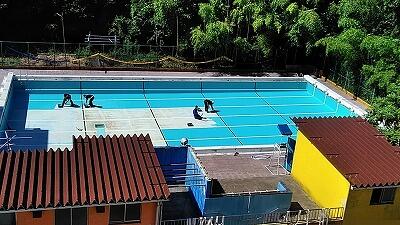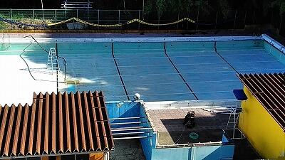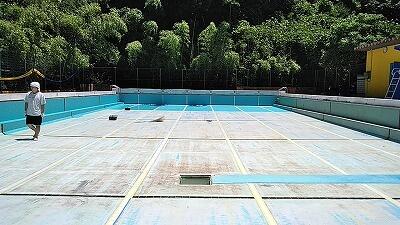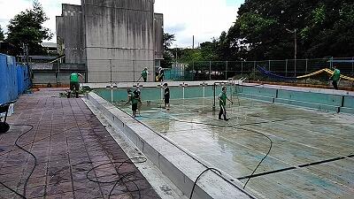 ↑作業開始!(あらかじめ水は抜いていましたが,プールの底はけっこう汚れています)