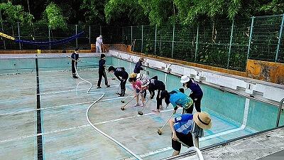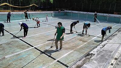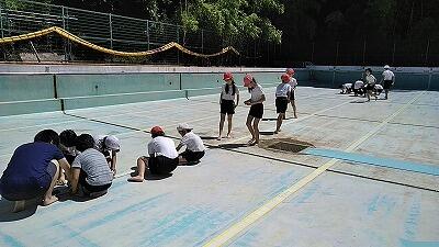 うす曇り気温24度,絶好のプール清掃日,「おやじの会」の皆さんのご協力で約1時間できれいになりました。ご協力ありがとうございました。