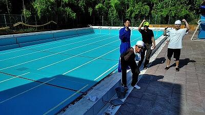 ↑6月2日にプール掃除をしてきれいです ↑まずは6年生がマスキングテープはり