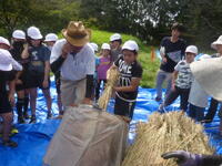 本日は前回同様,酒井根小学校と合同で,先週「稲刈り」した稲を「脱穀」しました。