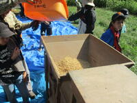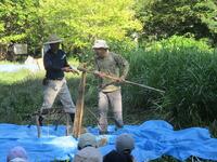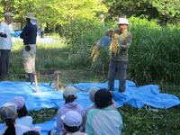 5年生が下田の杜で脱穀体験をしました。始めに下田の杜の方から稲から実をとる作業の歴史についてお話をいただきました。その後,千歯扱きなどの道具を使って脱穀体験を行いました。暑い中,一人一人が集中して体験に取り組む姿を見て,2週間後の林間学校でも様々な活動に積極的に挑戦してくれるだろうと感じました。