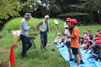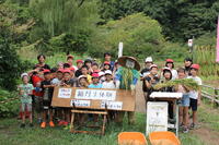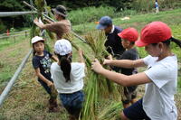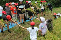 下田の杜で酒井根小学校と合同で稲刈りを体験しました。自分たちが植えた苗が大きく成長していることに驚いていました。ぬかるむ足場に悪戦苦闘しながらも鎌を使ってしっかりと稲を刈ることができました。