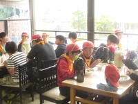 昼食場所である富士屋観光センターに到着。昼食をとっています。