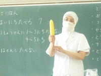 栄養士の先生から,今日の給食の食材である「トウモロコシ」についてのお話を聞き,実際に皮むきを行い