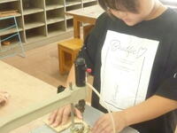 糸のこ盤を使い,自分で考えた形に切断していきます。切断した部品を紙やすりで形を整え,