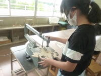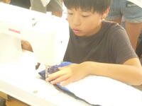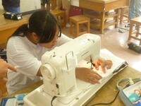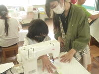 ミシンを使って縫っていきます。ミシンも手慣れたものです。紐を通す穴もしっかりと縫うことができ,