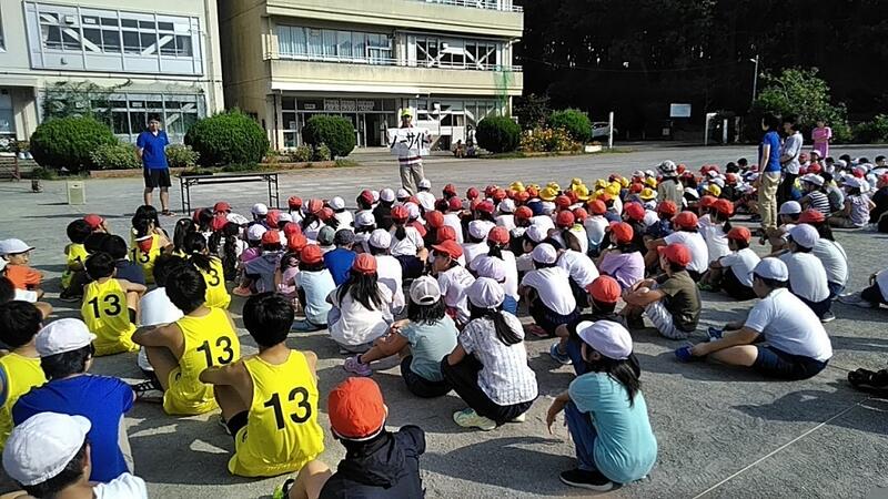 一足早く、10月の全校朝会を校庭で行いました。