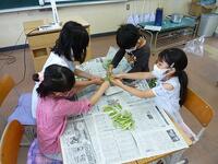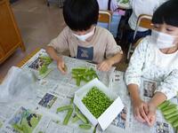 お話ししていただきました。グループごとにさやむきを体験。楽しそうに,手際よく取り組んでいました。