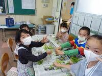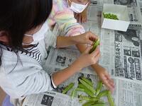 2年生では,給食の食材の下ごしらえ「さやむき」を体験しました。