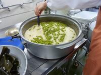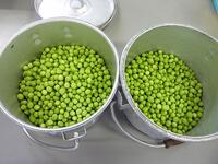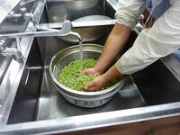 実際にさやむきをしたグリーンピースは給食室に運ばれ,今日の給食メニュー「グリーンピースご飯」と
