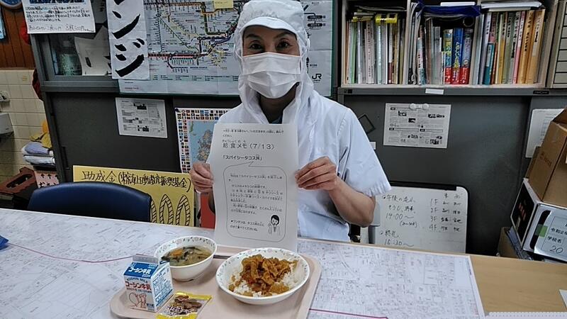 ↑スパイシータコス丼他 ↑給食メモを手にする栄養士の十亀(そがめ)先生