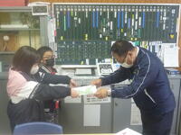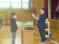 全校朝会では6年生の代表のみで,他の学年はお昼休みに校長室にて手渡しました。