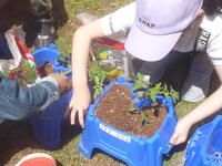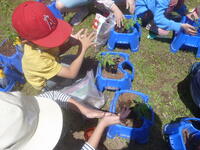トマトの苗を鉢に植えました。これからひとりひとり苗を育て,おいしいトマトを育てます。