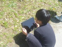 各自タブレットを持って,校庭で見つけた花や虫たちを写真に撮っています。