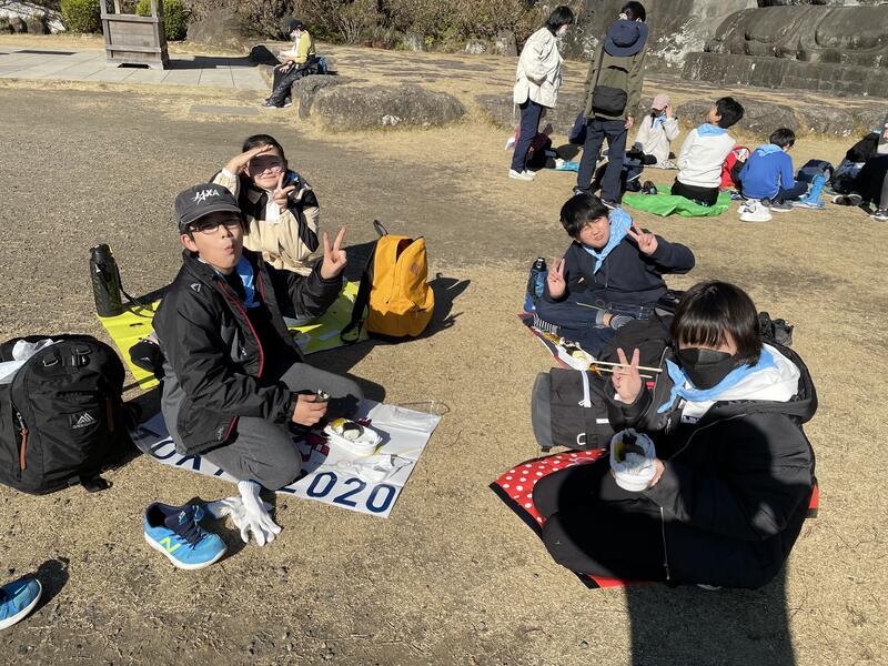 たくさん歩いた子どもたち。おにぎりを口いっぱいにほおばっていました。