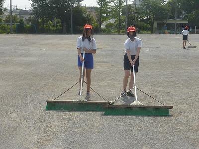 曲がらないようにしっかりラインを引こう! 校庭を平らにしまーす。結構楽しいかも!