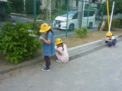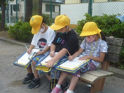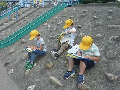 三角公園での子どもたちの様子です。発見したことをプリントにまとめるのに集中していました。