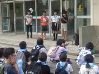 降車後、昇降口にてリーダーを中心に,「到着式」を行いました。