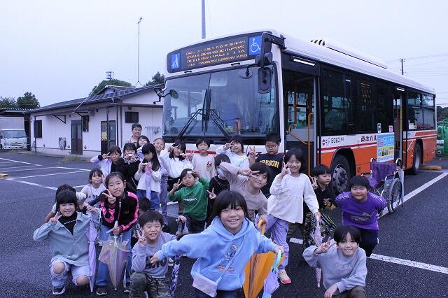雨模様ですが、楽しみにしていた校外学習です。雨でもみんな笑顔で元気です。