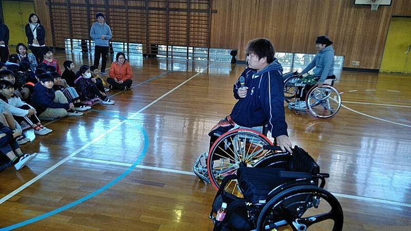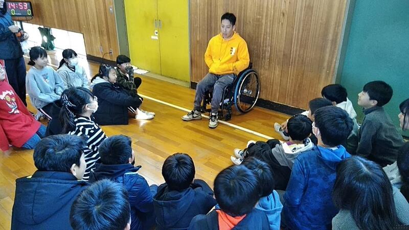 「パラリンピックキャラバン~車いすバスケットボール~」を5,6年生が体験しました。講師は、髙橋剛志さん諸隈有一さん清水健悟さんと司会の中山薫子さんでした。