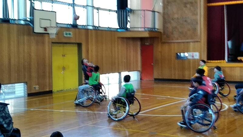 ↑代表児童による車いすバスケットボールの試合(左5年生・右6年生)ですがなかなか入りません