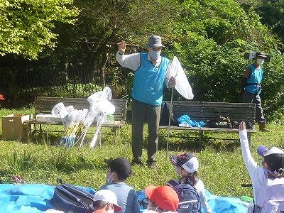 田中さんから,虫取りの極意を教えてもらう子どもたち。
