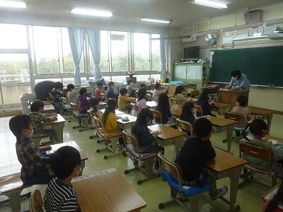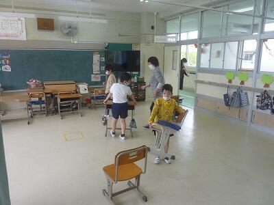 1年生 朝の会。「はい元気です!」 5年生 一発目の漢字テスト!