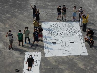 6年生が紙で作った実物大の奈良の大仏の顔と右手でした。