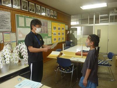 今日は,ゆなさんに読書賞の賞状を手渡しました。