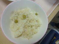 実際にさやむきをしたグリーンピースは給食室に運ばれ,今日の給食メニュー「グリーンピースご飯」と
