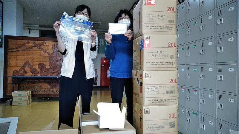 ←寄贈いただいたフェイスガード・マスク・消毒液