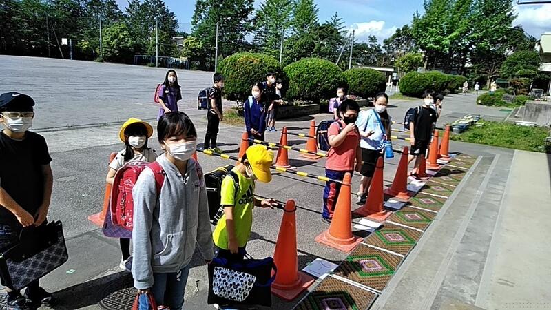 ↑昇降口前にソーシャルデイスタンスを意識して並び、手洗いをして教室へ