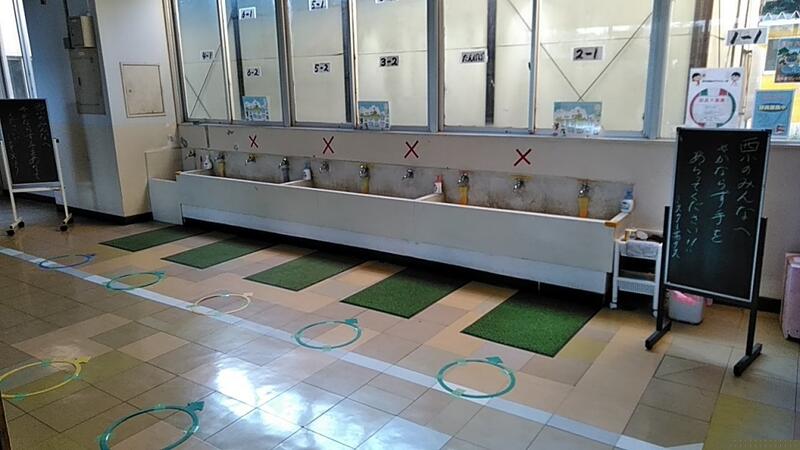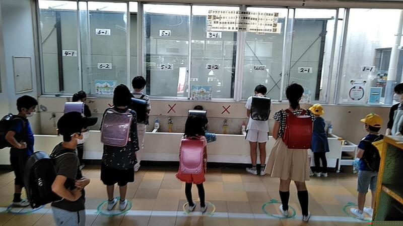 学校では、ソーシャルディスタンスを保てるように、手洗い場やトイレなど一定の距離に、印をつけました。