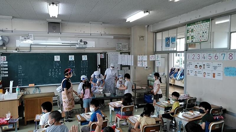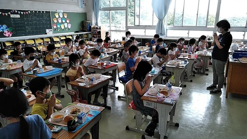 ↑1年生の給食当番も上手です ↑みんなで前を向いて「いただきます」