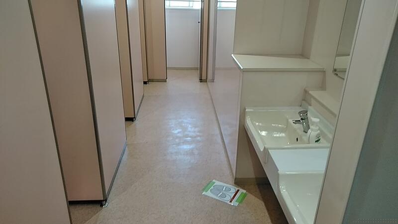 ↑消毒液でドアノブや壁などもふきます ↑最後は床を水拭きするとぴっかぴかに!