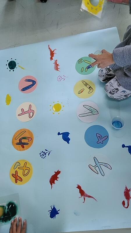 ↑台紙に恐竜・花・太陽など色々な種類の型紙をのせ、色づけをします