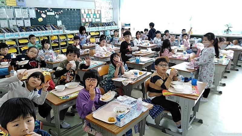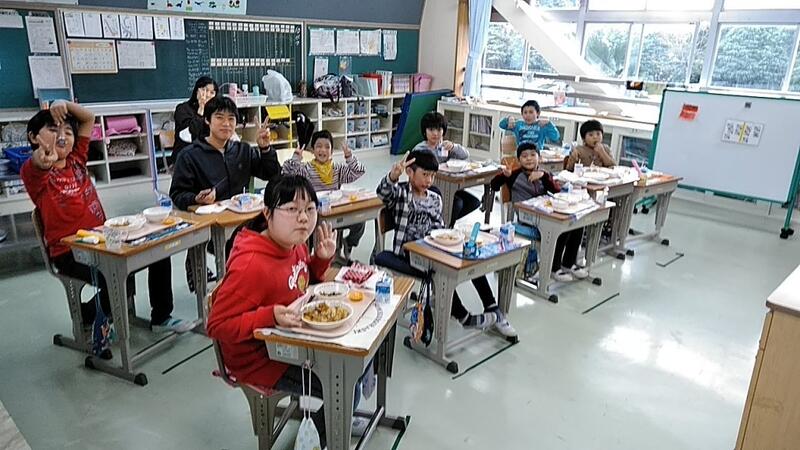 ↑今日の「ハロウィン」給食とおいしそうに食べる子どもたちと食器などの後片付けもきれいなワゴン