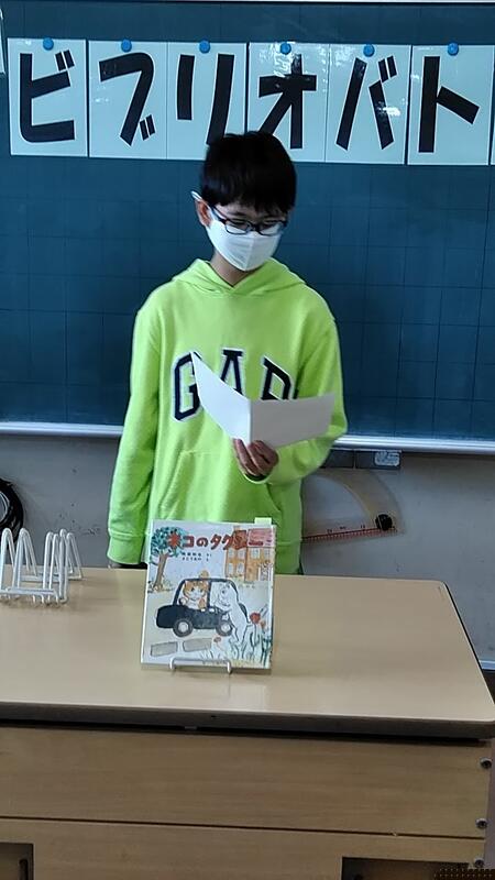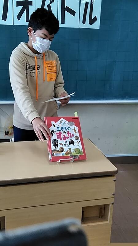 読書週間にちなみ、3年1組で「ミニビブリオバトル」が開催されました。これは、6年生の図書委員4名が、3年生に読んでもらいたい本を選び、その本の良いところ等をプレゼンテーションし、最後に3年生がどの本が読みたいかを決めるというものです。