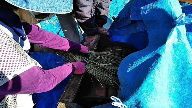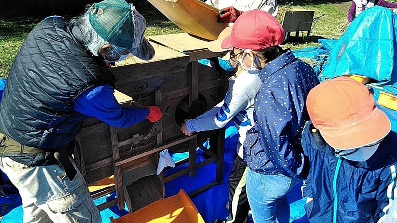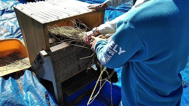 ↑足踏み脱穀機で稲の穂先から籾(もみ)を落とします